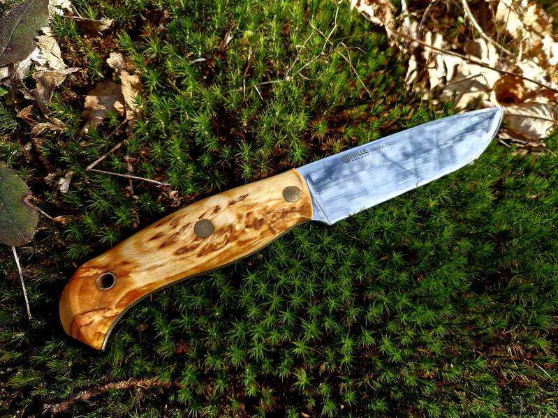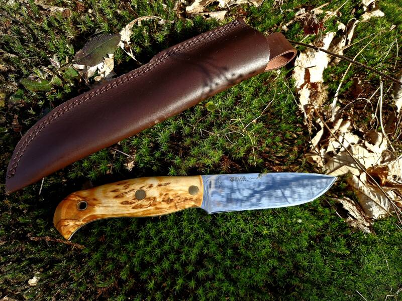 Helle Nordlys FG is an absolute amazing full tang knife. It is made of a solid stainless steel blade and a waonderful curly birch handle. Nordlys is the smaller version of the Helle Nord knife, that personally fits too big for me. It's name means "Northern Lights" in Norwegian, elements that represents perfecly the country in which is made. Even in this knife is a full tang, it is more reccomended to use it for light and fine works, in fact I use it for camps cooking, little bushcraft wood works, it worked with batoning too just for a test and it did his job perfectly, but I always bring with my a small or medium ax, so I don't use the knife for heavy works. This knife is really impressive, and even if it is quite expensive, I really reccomend it, as all Helle knives.