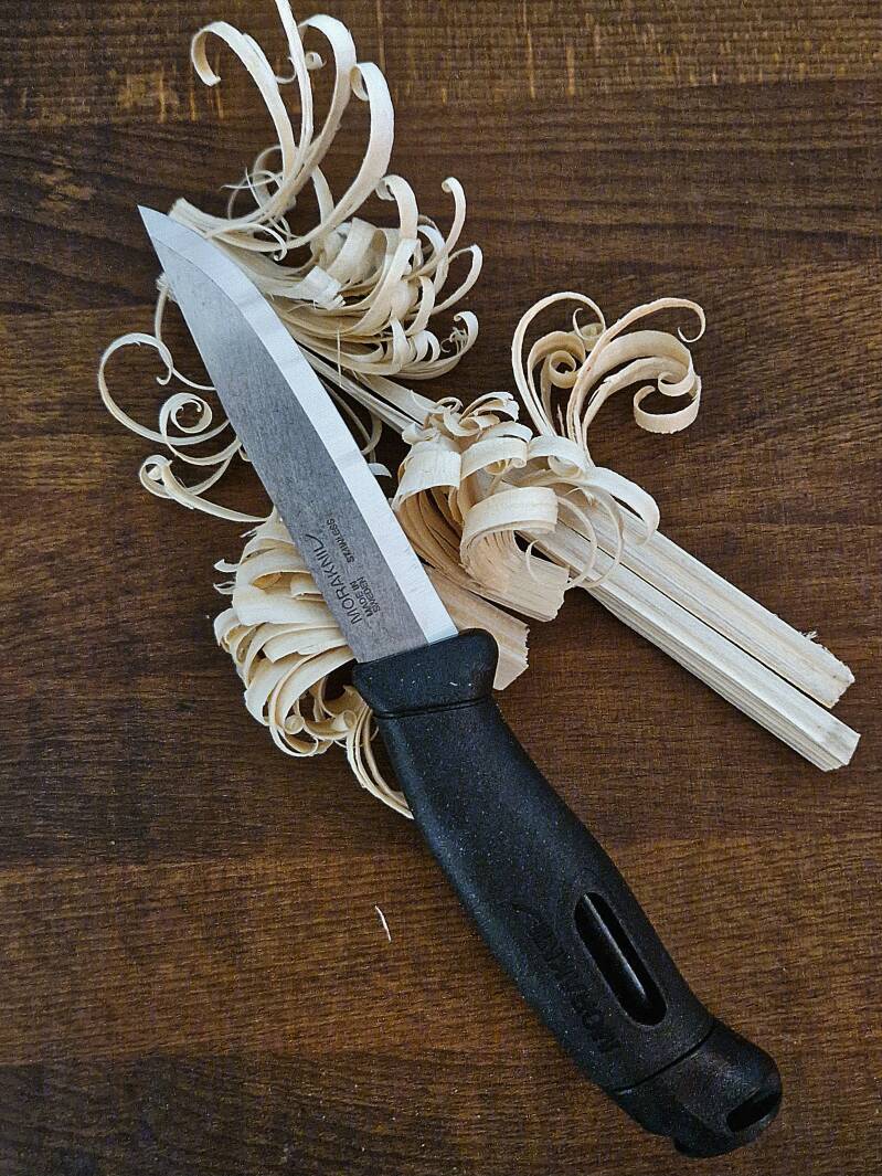 The Morakniv Companion Spark (S) | Fire Starter has a Skandi grind profile of the blade, that is made of Swedish stainless steel, and its spine has a 90° sharp angle to have an easy use with the ferro-rod integrated in the knife. The handle has a friction grip, at the bottom there is the integrated ferro-rod and a lanyard hole to tide a piece of paracord that comes with the knife. At the moment I have just used it at home, to do minor bushcraft hand works like feather sticks (see the photo) and it worked perfectly, so I am pretty sure this knife will make his work even in the great outdoors.