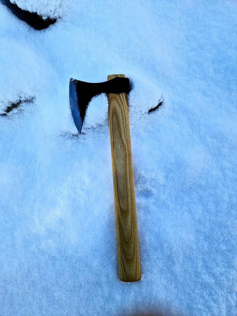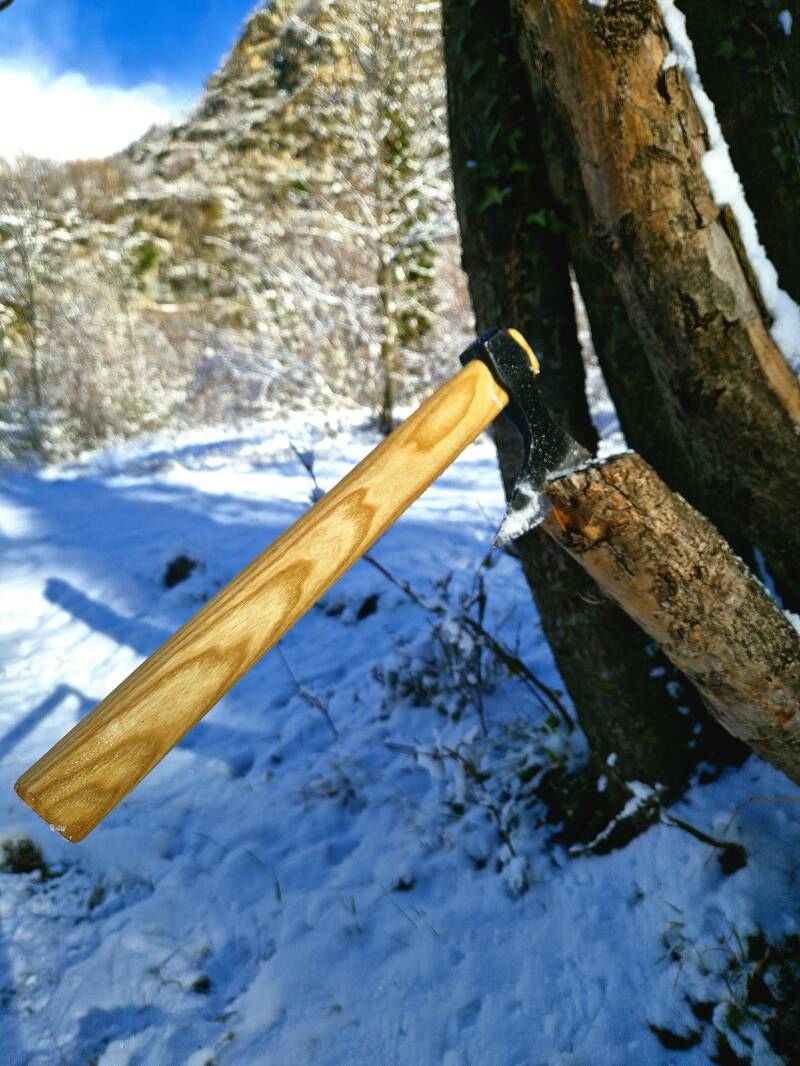 Grimfrost's Skeggox, Small in Old Norse means "Bearded Axe", in fact the shape of the head has the line of a man's beard. This axe has an old school look, very Vikingstyle for whom loves the genre. It has a strong handle made of ash wood, but the blade is quite thin so it is ok to be used with little sticks and not for big logs, it could twist or break. This product is hand made so there could be some differences between one and the other axe and there is written "GRIMFROST" in runic (the makers mark). It is perfect for short and daily adventures becasue it is a very light weight axe, I alwasys bring Skeggox with me in that occasion.