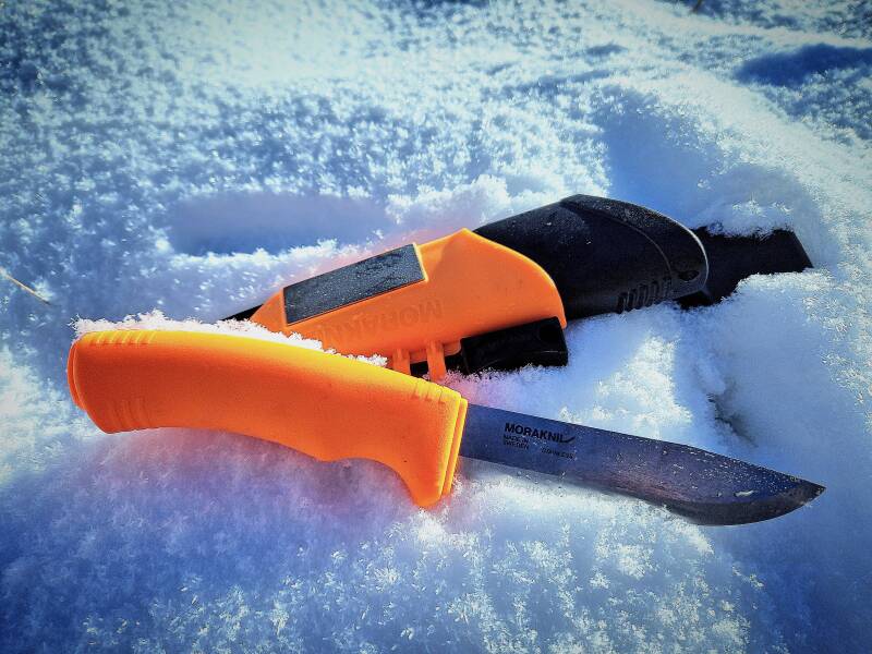 Morakniv Bushcraft Survival (S) - Hi-Vis Orange is a perfect tool for all outdoors activites. It is made by a 3.2 mm thick blade made of recycled Swedish stainless steel and by an ergonomic polymer handle features with a soft friction grip and finger guard, that makes it safe and comfortable even in wet conditions. The Survival edition has as additional tools in the sheath: a good quality ferro rod to light up a campfire, and a little sharpening stone incorporated on the side. This knife comes in different colors and blades. I have choosen the Hi-Vis Orange because it's easy to find it in the nature thanks to his bright color and his stainless steel is perfect in humid and wet places because it does't rust.